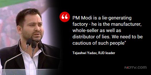 আরজেডি নেতা তেজস্বী যাদব বলেন, “ প্রধানমন্ত্রী একজন মিথ্যাবাদীর কারখানা। সে মিথ্যা তৈরি করে, সেই মিথ্যাকে হোলসেলে বিক্রি করে সেইসাথে রিটেলেও বিক্রি করে। এইরকম লোকদের কাছে থেকে আমাদের সাবধান থাকা উচিত”।