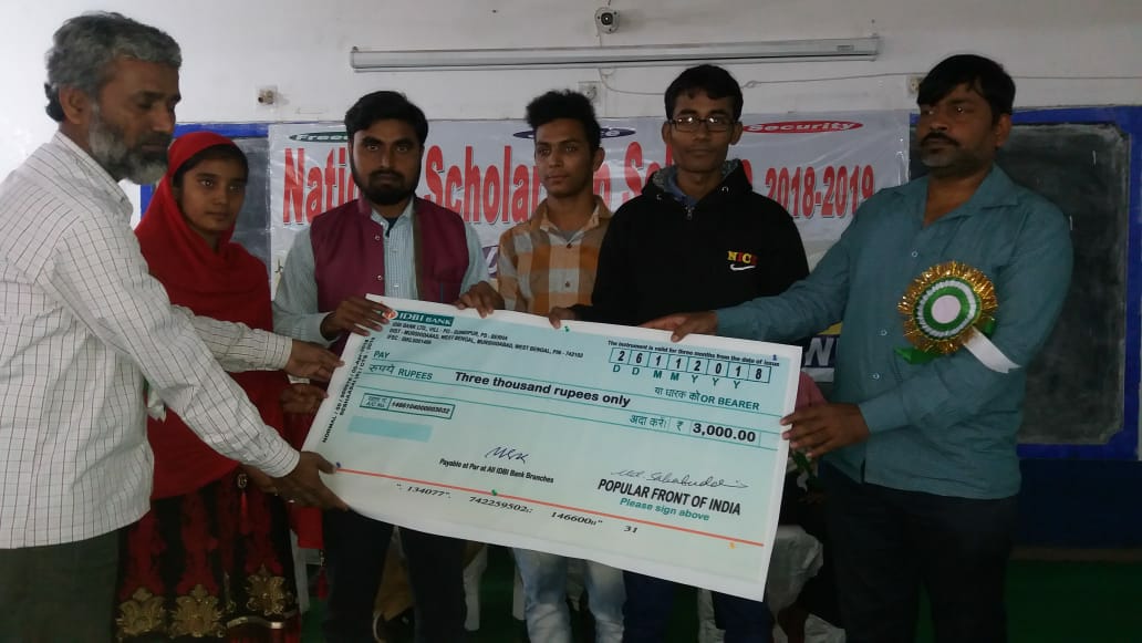 পপুলার ফ্রন্ট অফ ইন্ডিয়া সমাজসেবামূলক সংগঠন। দেশব্যাপী এই সংগঠনটি বিভিন্ন সামাজিক কর্মসূচি চালিয়ে থাকে এই সংগঠন ।যার মধ্যে অন্যতম হলো দুঃস্থ ও মেধাবী ছাত্রছাত্রীদের উচ্চ শিক্ষায় শিক্ষিত করে তুলতে লোন স্কলারশিপ প্রদান। আজ পপুলার ফ্রন্ট অফ ইন্ডিয়ার উদ্যোগে আজ তারই অংশ হিসাবে মুর্শিদাবাদের সুতি থানার অন্তর্গত এ.এম টিচার্স ট্রেনিং ইনিস্টিটিউটে জাতীয় শিক্ষা বৃত্তি অনুষ্ঠানের আয়োজন করা হয় প্রতি বছরের ন্যায় এবছর ও দুস্থ-মেধাবী ছাত্র-ছাত্রীদের শিক্ষা ও মানসিক বিকাশের লক্ষে এই বছর ভারতের বিভিন্ন রাজ্যে স্কলারশিপ দেওয়া হচ্ছে। পশ্চিমবঙ্গে ৩০০ অধিক ছাত্রছাত্রীদেরকে স্কলারশিপ দেওয়া হবে বলে সংগঠন সূত্রে খবর। এইদিন বীরভূম ও মুর্শিদাবাদ জেলার জঙ্গিপুর সাব ডিভিশনে এ.এম টিচার্স ট্রেনিং ইনিস্টিটিউটে ৯৪ জন ছাত্র-ছাত্রী কে স্কলারশিপ প্রদান করা হয়।