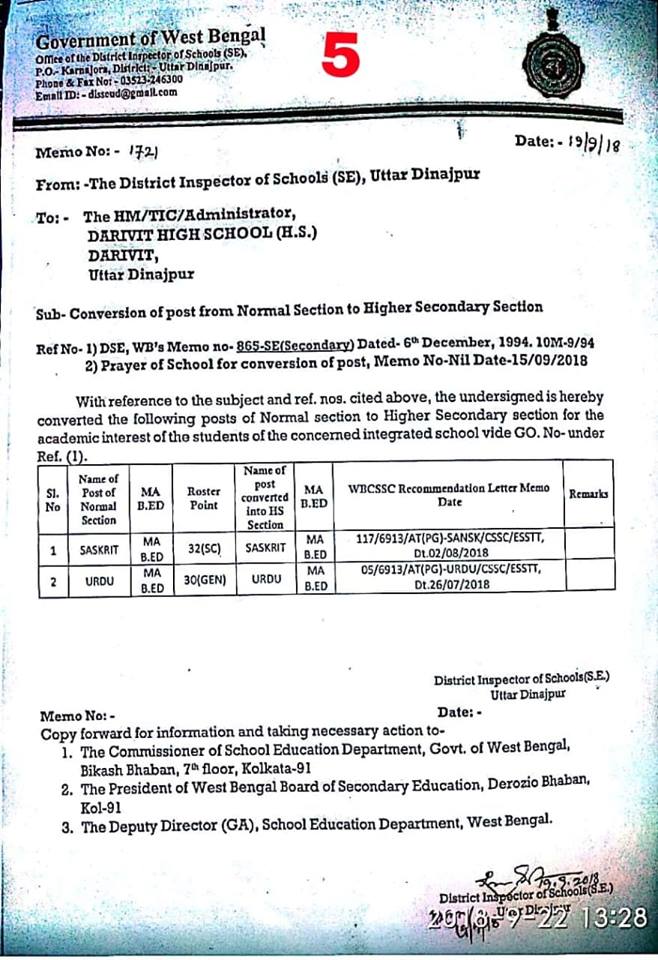 ১৮/০৯/২০১৮ তারিখে উর্দু এবং সংস্কৃত শিক্ষকের পদ বাতিলের আবেদন করে ডি আই-কে ম্যানেজিং কমিটির দেওয়া চিঠির বৈধতাঃ