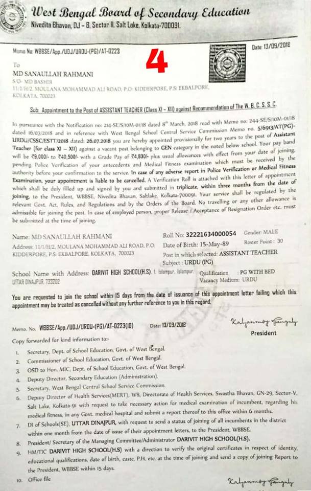 উর্দু শিক্ষক মোহাঃ সানাউল্লাহ রাহমানীর সুপারিশ এবং নিয়োগপত্র কি বৈধ ছিল?